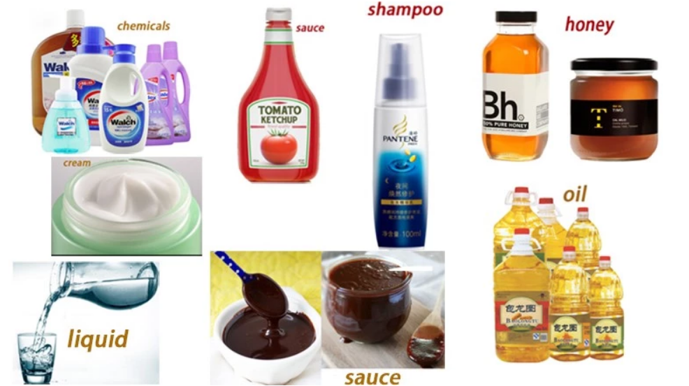 Puoli- ja viskoosiset nesteet; kissanuppi, sinappi, siirapit, salsa, majoneesi, hunaja, maapähkinävoi, hyytelöt, kastelukastikkeet, huulivoide, shampoo, paksut saippuat, muotoiligeelit, kasvonaamarit, vaha, liima, rasva, tiivisteaineet, silikoni ja paljon muuta