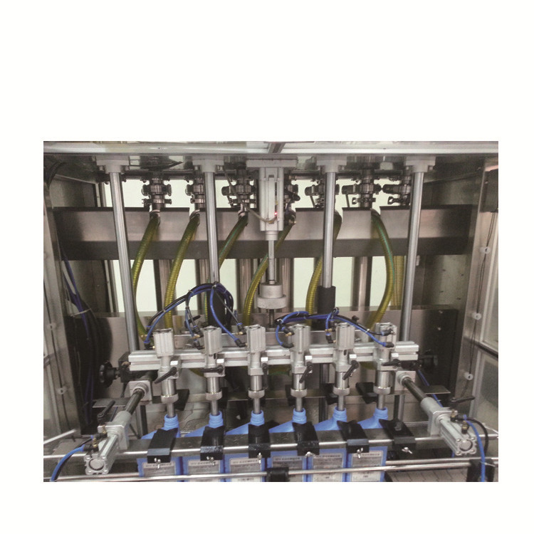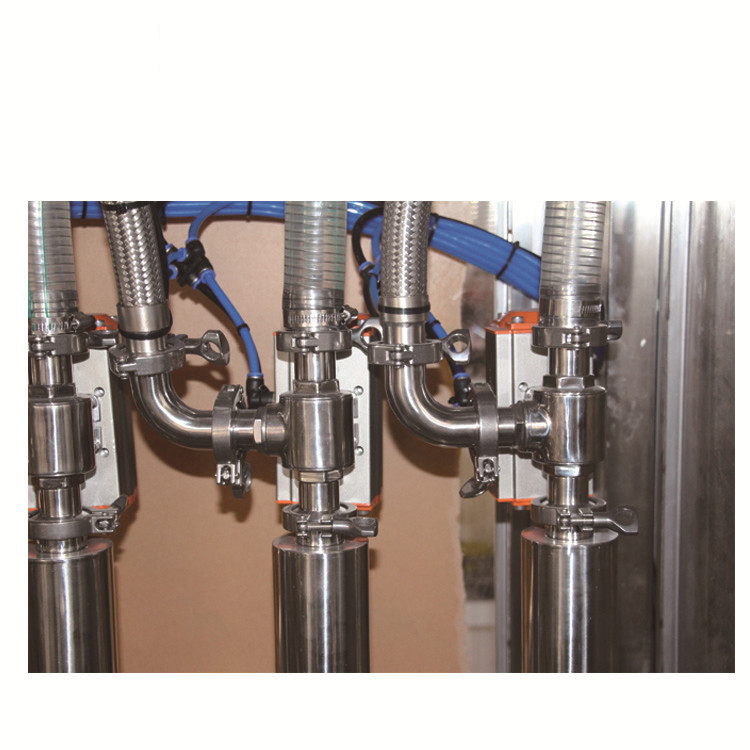 3. Se voi tyydyttää suuremman tuotantotarpeen omaksumalla kaksikiskoisen pullon syöttö, kaksikiskoinen täyttö ja kahden suuttimen korkin ruuvaaminen tai vieriminen ja puristaminen. Tällä koneella on korkea täytötarkkuus, ja se voidaan hajottaa ja steriloida kätevästi, käyttämällä nopean liitoksen ruostumattomasta teräksestä valmistettua mäntäpumppua. Käytettäessä jatkuvaa vääntömomentin korkkiruuvia ja pneumaattista suojaa, suljettu suu on tiivis.